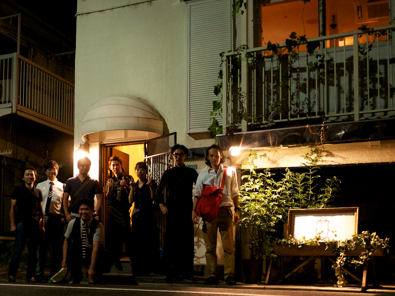 ほんの数週間前までは住宅にしか見えなかったエントランス前で記念撮影。